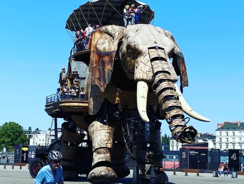 Arrivés sur l’Ile de Nantes, les élèves ont été accueillis par l’Éléphant des Machines qui les a arrosés ! Pour se sécher, rien de tel qu’un pique-nique à l’abri de la grue jaune et de sauter sur les trampolines de l’attraction “On a marché sur la Lune”.