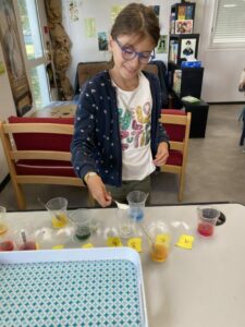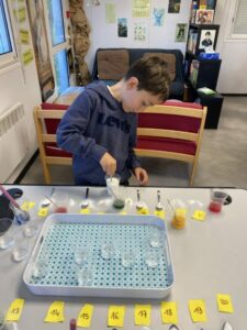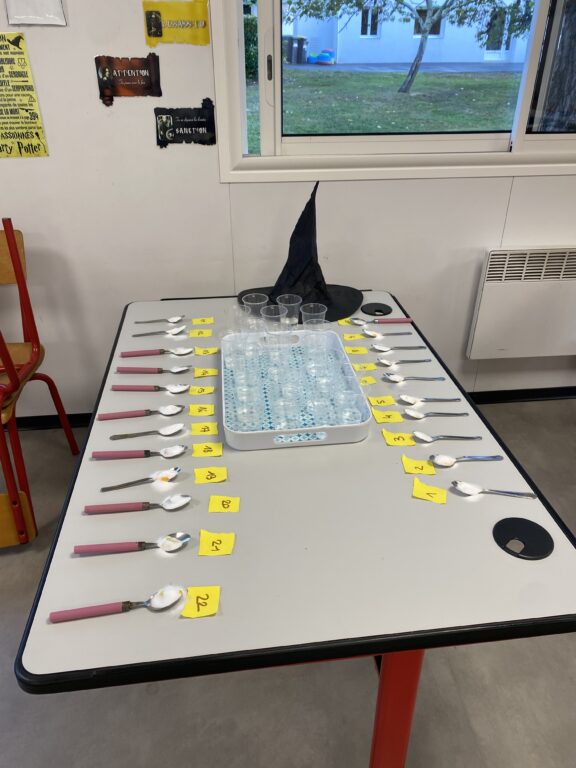 Mais cette année, une nouveauté a eu lieu chez les CE1/CE2 : pour découvrir leur maison, une expérience les attendait le jour de la rentrée ! Chacun devait prendre une cuillère et la plonger dans un élixir magique qui a pu révéler la couleur de sa maison !